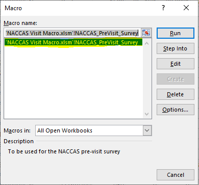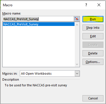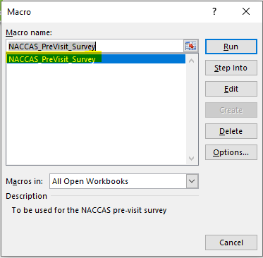 | 8. | Select NACCAS_PreVisit_Survey from the macro list (may also say 'NACCAS Visit Macro.xlsm'!NACCAS_PreVisit_Survey) | |