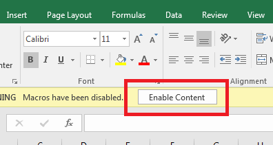 | 3. Select Enable Content. Depending on your Excel settings this may not be required; continue to step 5. | |