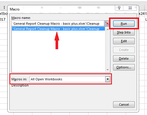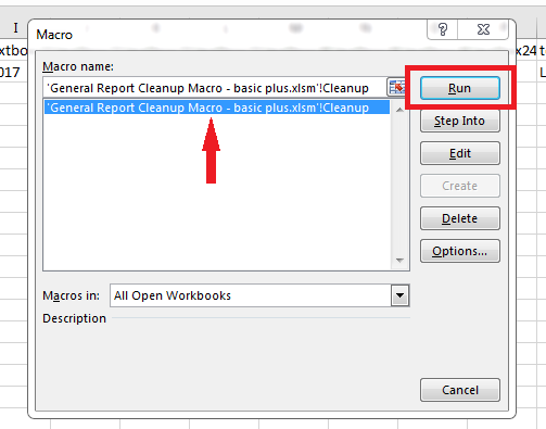 | 6. In the pop up box select the macro from the list and click Run. If the list is empty, ensure the Macros In drop down is set to All Open Workbooks. | |
