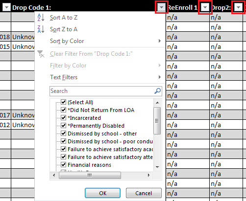 | 7. Once the macro finishes running you will have an organized sheet and many reports will have configurable headers. Click the drop down arrow to set your criteria for inclusion in that particular column. |
